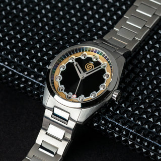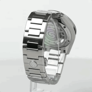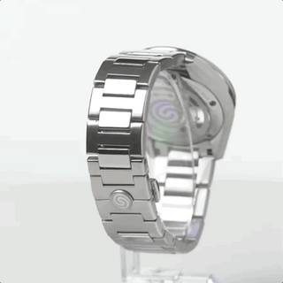 Mirror polished case back with etched pattern. Matching design with the dial.
